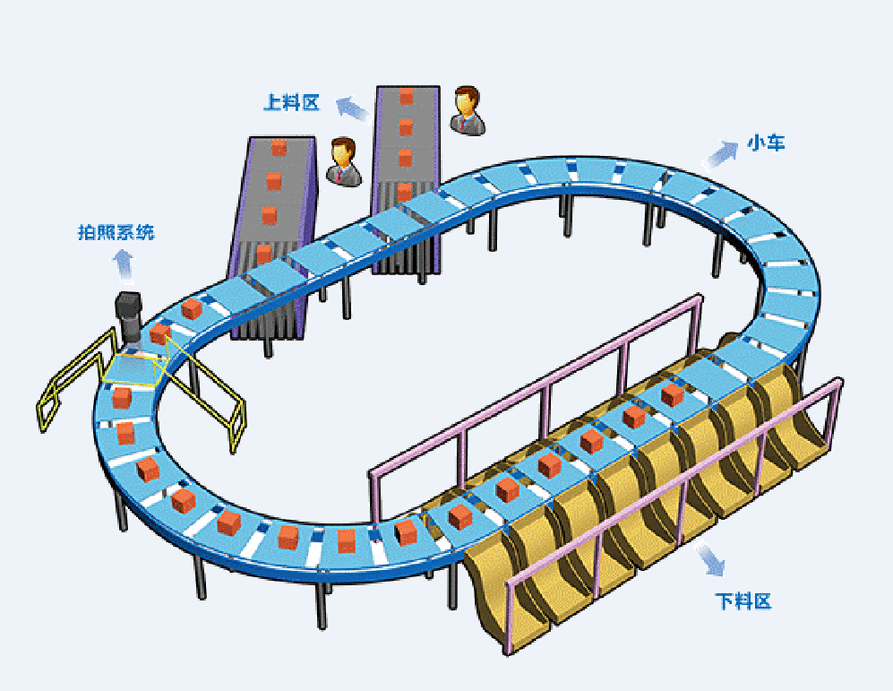 環形分揀線是整個智能物流系統中的核心設備(bèi),是提高分揀效率的關鍵環節。該設備(bèi)主要由小車(chē)、拍照系統、上料區、下料區(也叫格口區)這四部分組成: